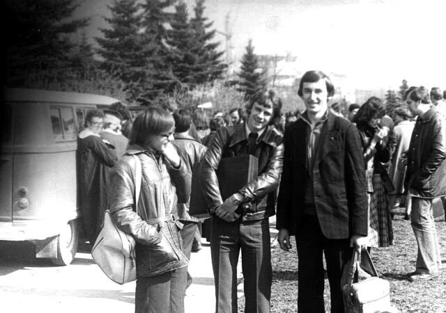 День Физика 1978. Толик Белоусов, Александр Иванов и Андрей Фомин возле трехзального корпуса.